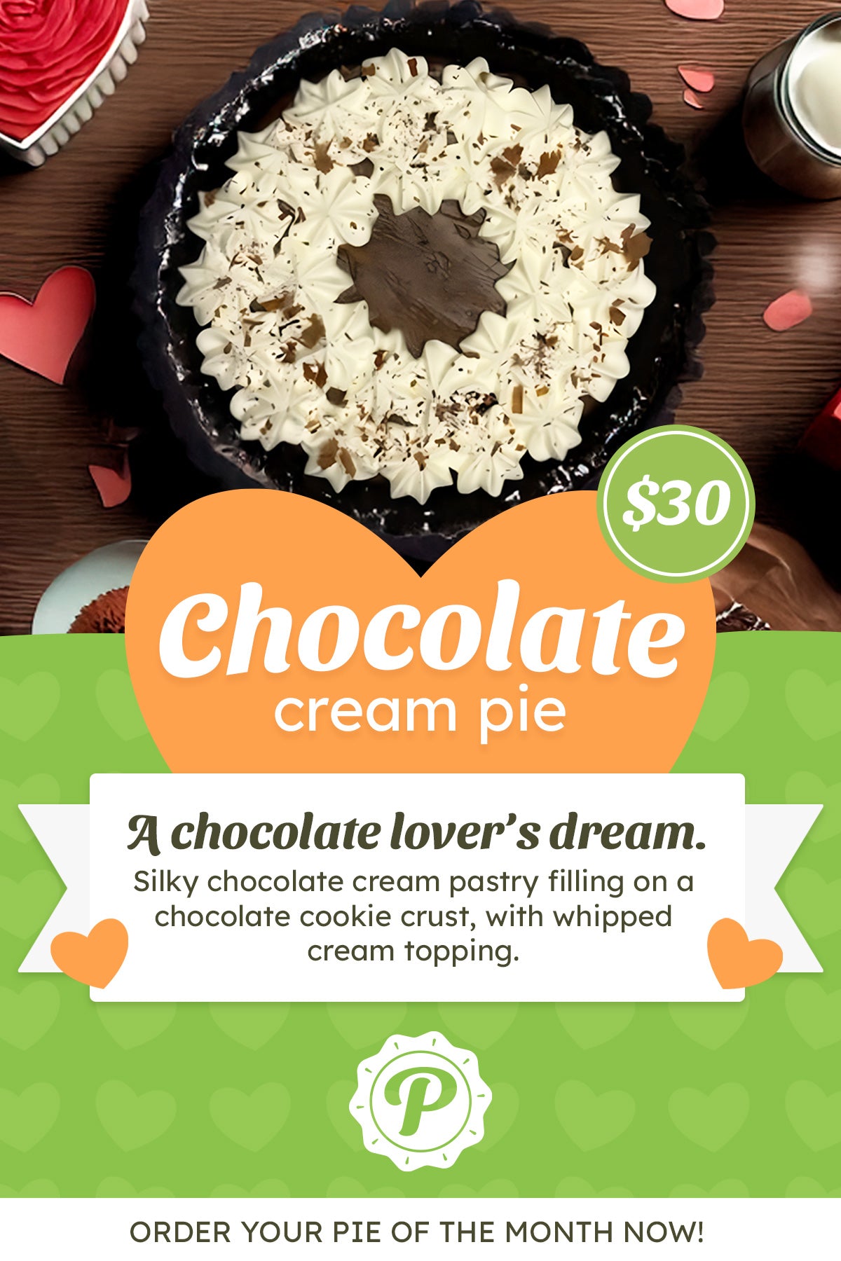 ​Looking for something more creative than flowers and candy for Valentine's Day? Surprise your sweetie pie with this Piemazing Chocolatey treat. The silky chocolate cream filling and homemade whipped cream topping, supported by an oreo cookie or our signature flaky, buttery crust will have her eating out of your hands. You'll thank me later!