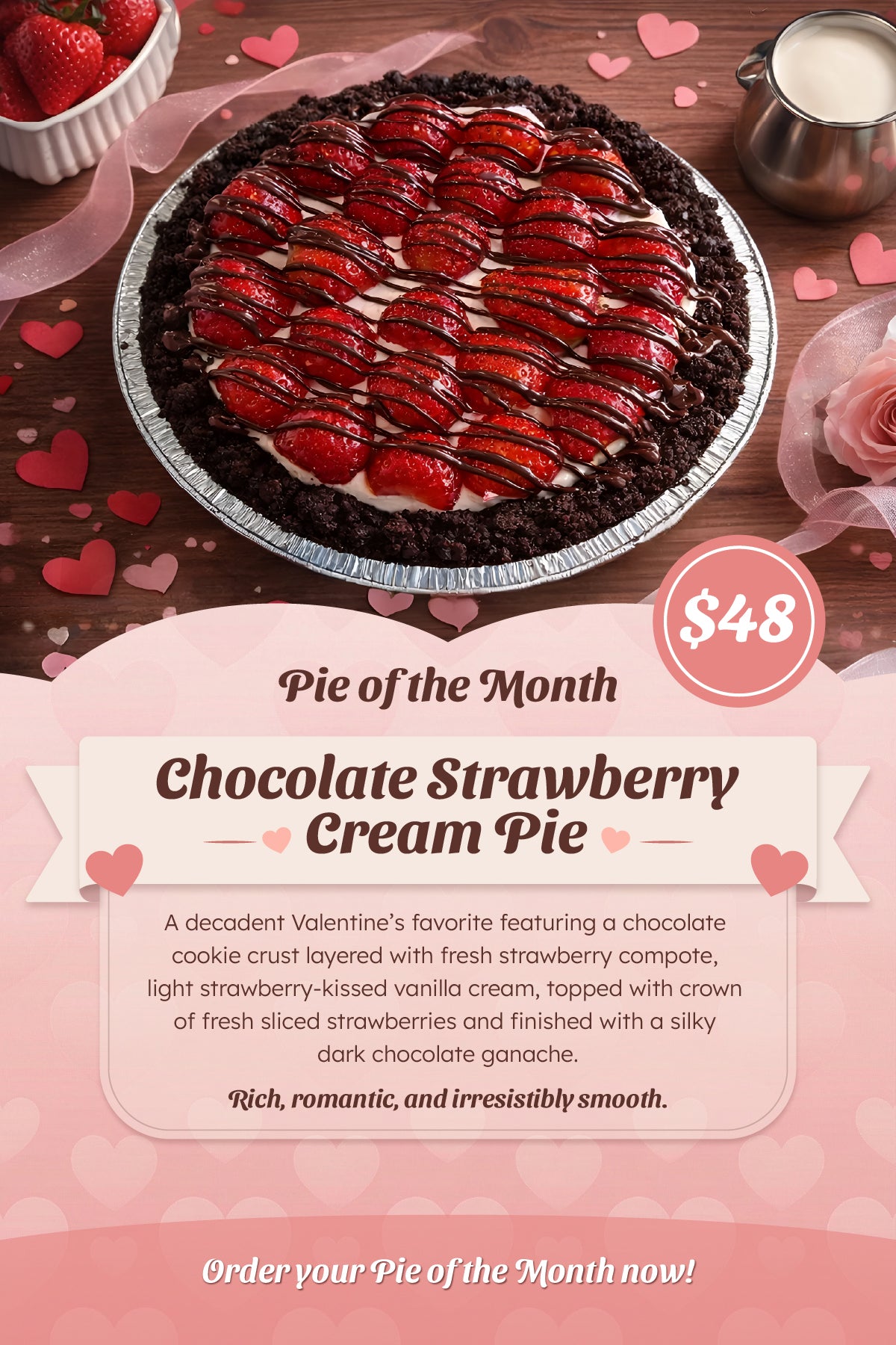 Looking for something more memorable than flowers and candy? Surprise your sweetie with this 9” Piemazing Chocolate Strawberry Cream Pie, featuring a rich chocolate cookie crust, fresh strawberry compote, strawberry-kissed vanilla cream, and a crown of fresh sliced strawberries finished with silky dark chocolate ganache. A romantic indulgence made to be shared.